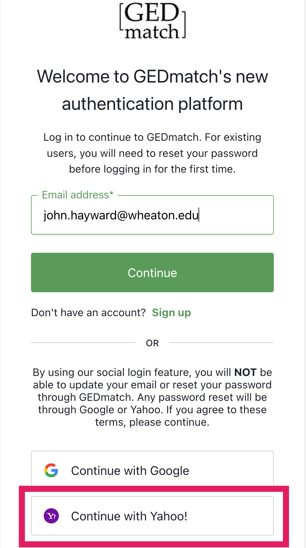 If your GEDmatch account has been linked to Yahoo! - to login on the login page click the "Continue with Yahoo!" button - here highlighted in red.