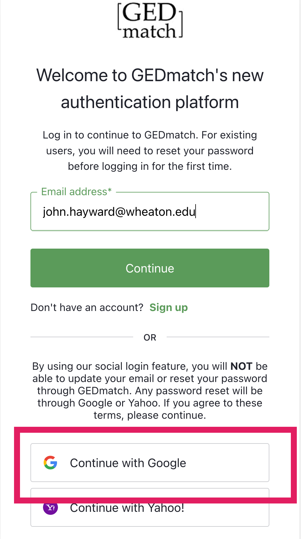 If your GEDmatch account has been linked to Google - to login on the login page click the "Continue with Google" button - here highlighted in red.